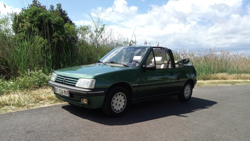 En soi, rien d’intimidant : il s’agit bien et avant tout d’une 205 3 portes. À peine remarque-t-on la vitre triangulaire fixe de chaque côté du pare-brise, l’absence d’entourage de vitres de portières et le tout petit couvercle de malle. Reconnaissable entre mille, la configuration Roland Garros, composée du splendide vert métallisé éponyme et d’une capote au blanc étincelant (quand elle est propre !), va comme un gant à la petite sochalienne.