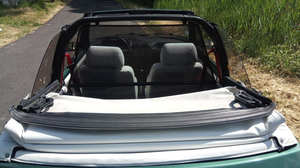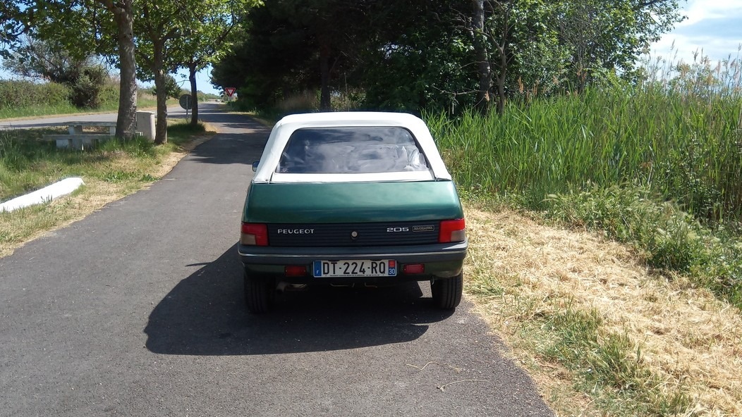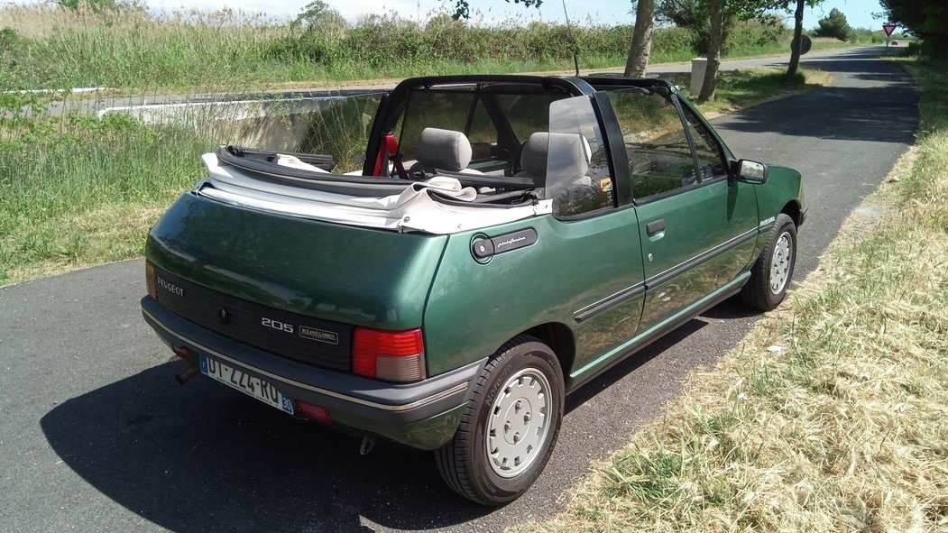 L’occasion de constater que le microscopique couvercle de malle ne laisse qu’un passage de coffre minimal, et nécessite de se plier en deux ou de s’accroupir pour accéder au fond du coffre. Gabarits de plus d’1m75, méfiance : le lumbago ou une bosse sur la tête ne sont jamais loin. Bon point néanmoins pour la banquette arrière rabattable en 2 parties (la 205 cabriolet est une quatre places), dont les manettes sont accessibles depuis le coffre. On ne transportera pas l’armoire normande de tante Simone, mais pour un objet long et pas trop encombrant, la cab’ sera partante.
