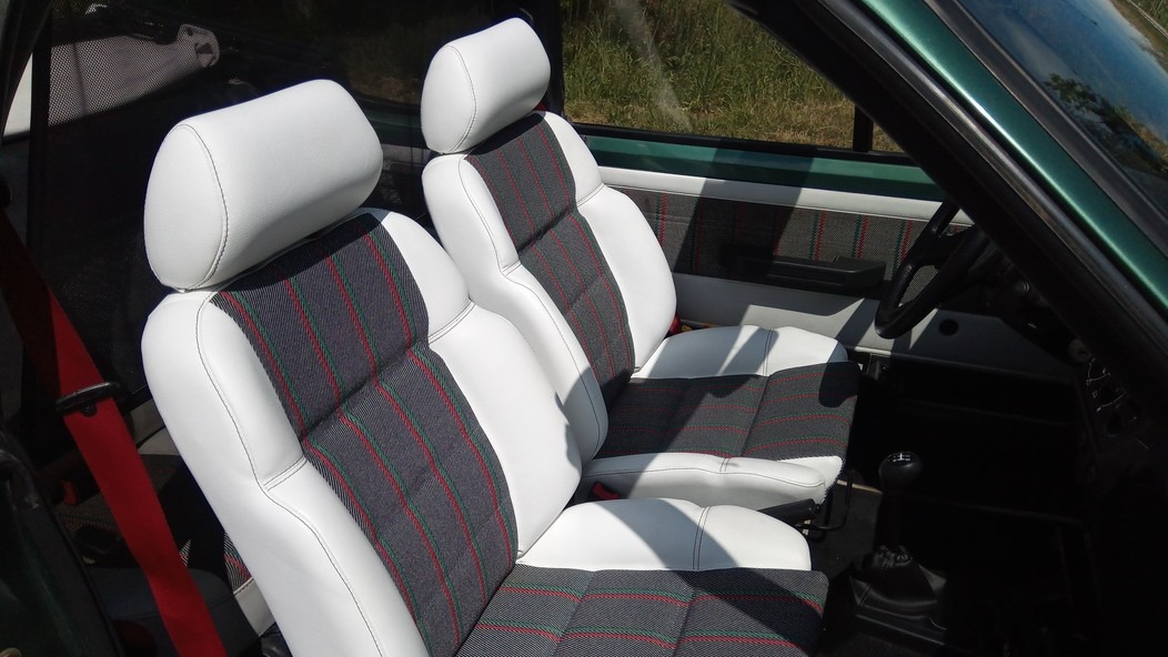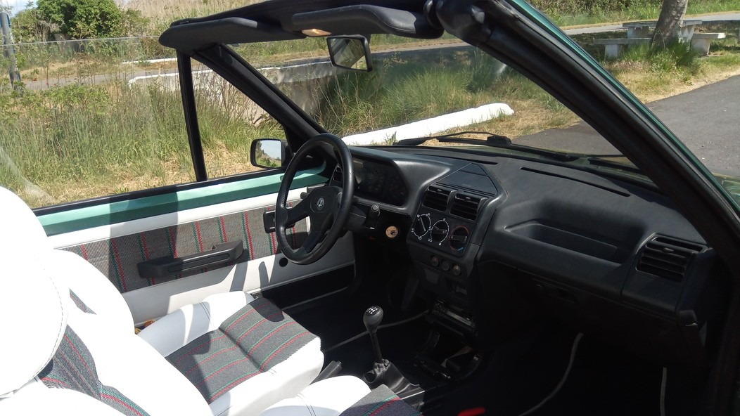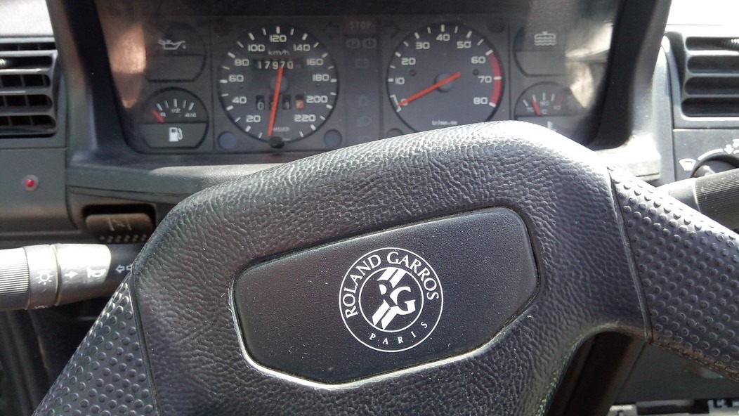 À l’intérieur, le ton est immédiatement donné : sièges de 205 GTI avec bourrelets en cuir blanc et tissu spécifique au centre, ceintures de sécurité couleur « terre battue » en clin d’œil à l’origine tennistique du modèle et logo Roland Garros sur le moyeu du volant (gainé de cuir), en lieu et place du lion habituel. Même à l’intérieur, il s’agit de rappeler aux occupants qu’ils ne sont pas dans n’importe quel modèle de 205 cabriolet !