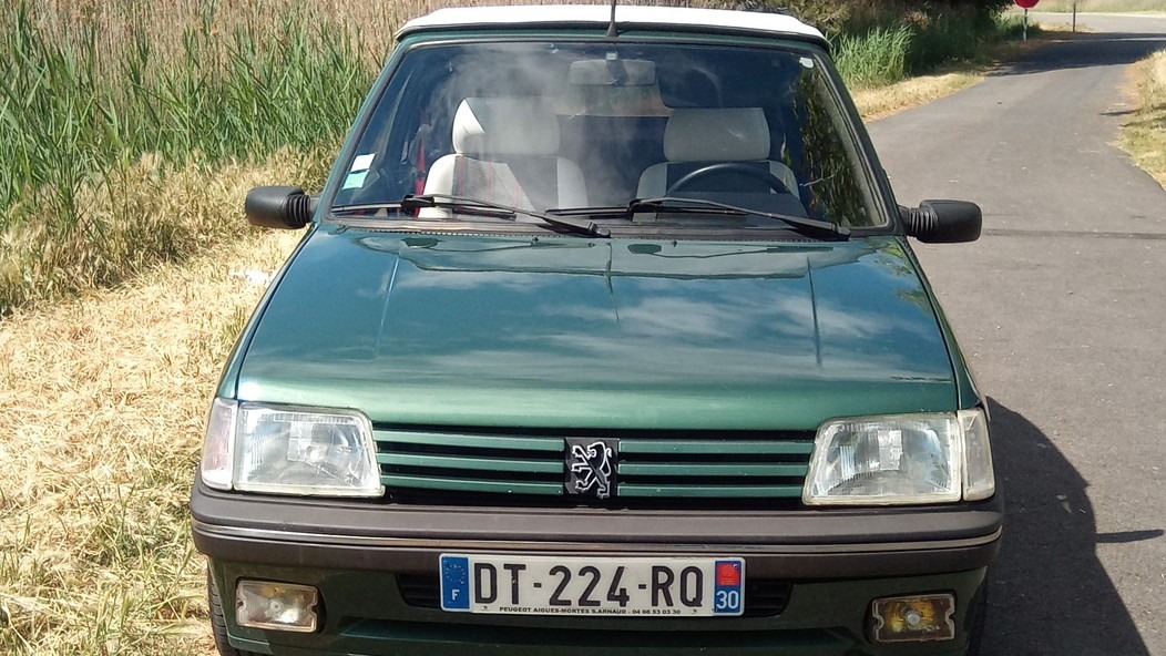 En soi, rien d’intimidant : il s’agit bien et avant tout d’une 205 3 portes. À peine remarque-t-on la vitre triangulaire fixe de chaque côté du pare-brise, l’absence d’entourage de vitres de portières et le tout petit couvercle de malle. Reconnaissable entre mille, la configuration Roland Garros, composée du splendide vert métallisé éponyme et d’une capote au blanc étincelant (quand elle est propre !), va comme un gant à la petite sochalienne.